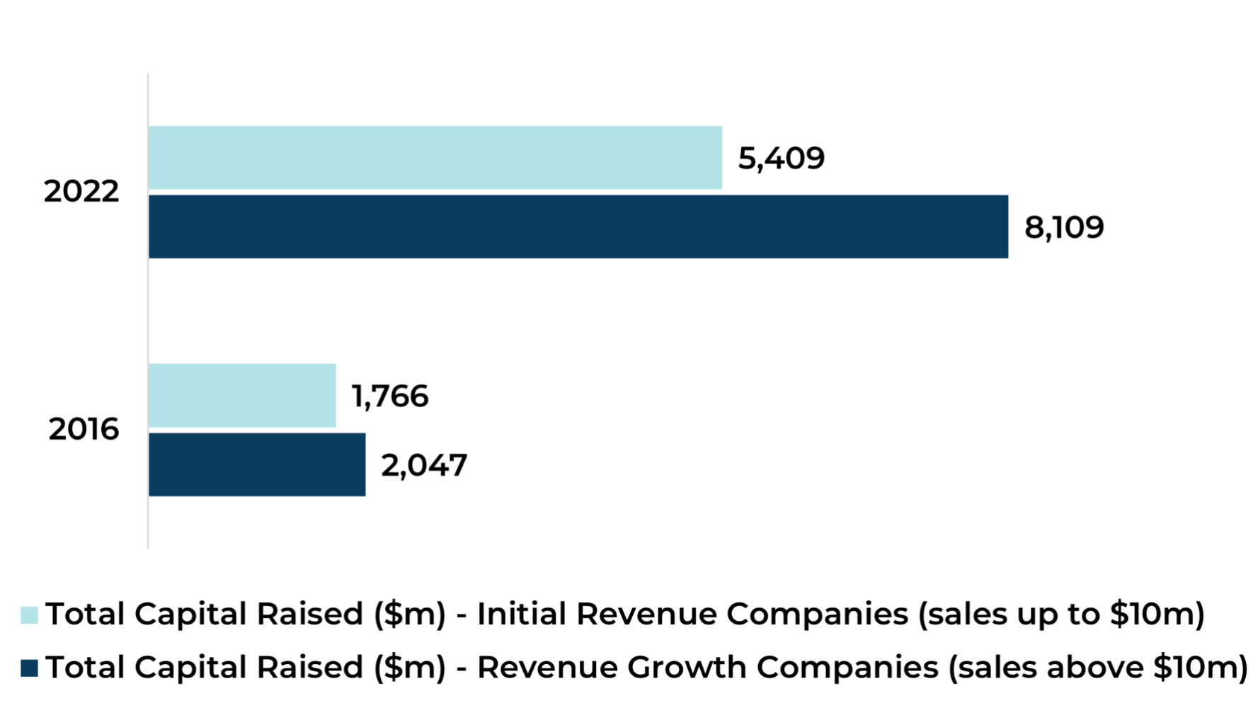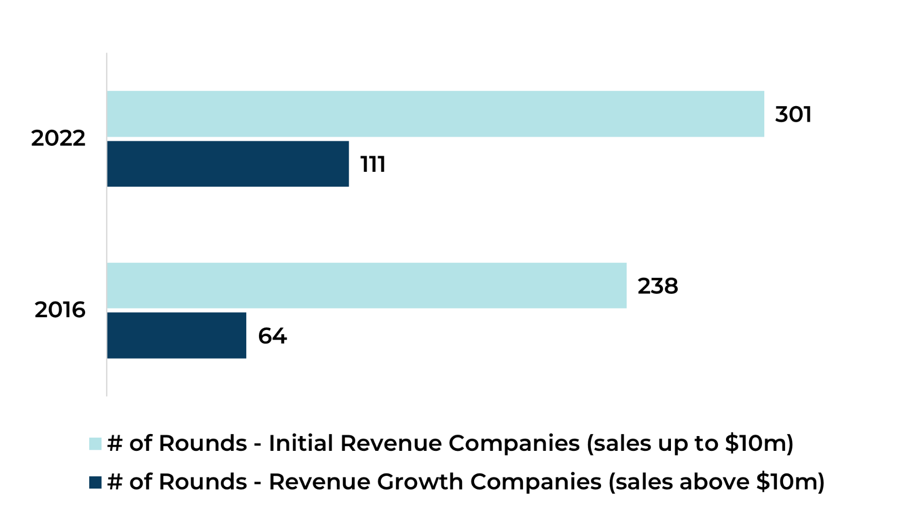 The amount of money invested in Revenue Growth companies in 2022 is more than 4 times higher than it was in 2016.